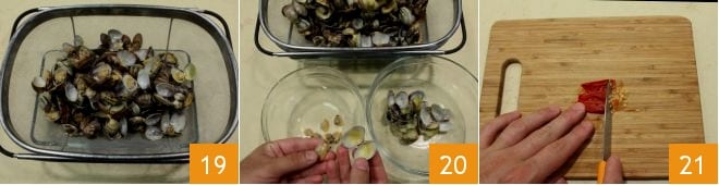 Once ready, you can drain them 19 and save the liquid created; shell them, leaving a few whole to add to the soup with the shell 20. Take the fresh chili, cut it open and remove the seeds 21, then slice it into strips.