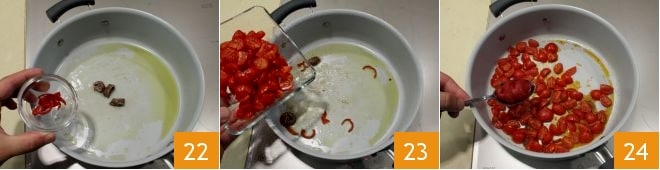 In a large saucepan, pour a drizzle of oil and sauté the garlic in its skin, which you can then remove with kitchen tongs. Then add the anchovy fillets and the chili 22. After a few moments, add 150 g of tomatoes cut into wedges 23 and season with salt and a tablespoon of tomato paste. While the tomatoes soften over low heat,