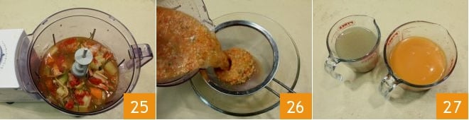 you can blend the shellfish broth with a mixer 25. Then pass it through a sieve to obtain only the liquid part 26. You will thus have ready the broth and the clam cooking liquid 27,