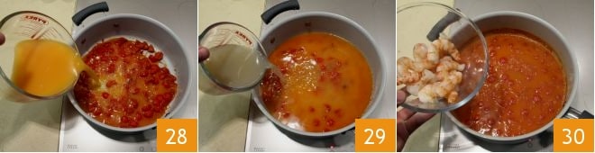 which you can add to the tomatoes (28-29). Cook everything over moderate heat for 20-25 minutes. Then add the shrimp 30 and cook for about 8 minutes.