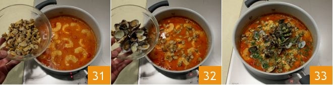 Finally, add the shelled clams and those with the shell (31-32). Adjust the salt if necessary and season with white pepper. You can accompany the clam soup 33 with croutons, toasting the bread slices under the oven grill.