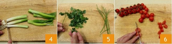 Clean the vegetables needed for the Shellfish Stock: cut off the beard of the spring onion and the green part 4 and cut it into rings; peel and chop the celery and carrot, then coarsely chop the parsley and chives 5. Finally, cut 150 g of tomatoes in half 6.