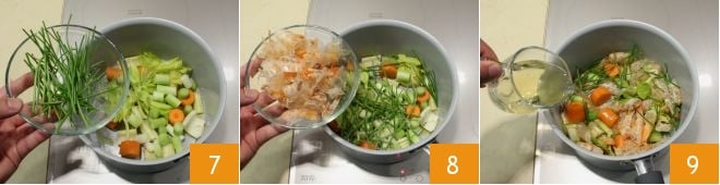 In a pan, place a drop of oil along with all the chopped vegetables 7, add the shells 8, and sauté for a couple of minutes over medium heat, then deglaze with 50 g of white wine 9