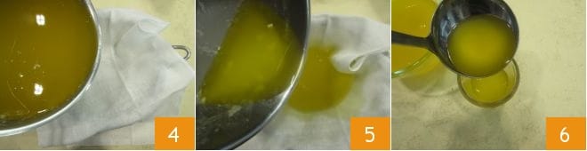 Place a funnel in a container and line it with a very fine sterile gauze 4, pour the liquid clarified butter making sure that the casein deposited at the bottom does not resurface; finally, place the liquid in jars. The clarified butter will become solid once it has cooled.