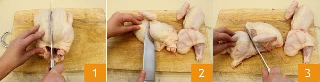 To prepare the clay pot chicken marinated with citrus, first start with the chicken: with a knife, cut it in half 1, first cut the wings, the thighs 2, dividing it into 4 parts 3.