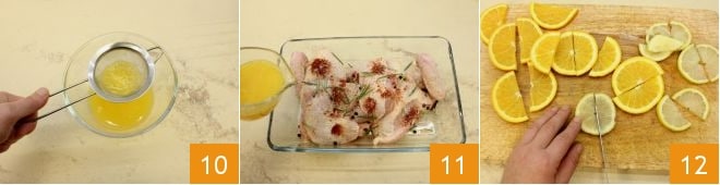 Filter the juice you have obtained with a fine sieve 10 and add it to the baking dish 11. Take 1 whole orange and 1 whole lemon, remove the ends. Slice them with the peel, then cut each slice in half 12; add the citrus slices to the baking dish, ensuring all parts are flavored.