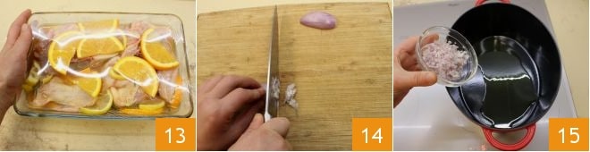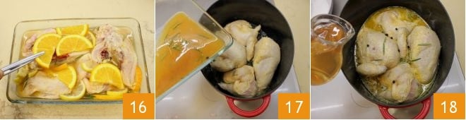Meanwhile, take the chicken and with kitchen tongs remove the citrus slices, keeping them aside along with the marinade liquid 16. When the shallot is sautéed, place the chicken in the pot, cooking it for about 2-3 minutes over medium heat on both sides and then pour in the citrus and spice juice you have saved 17. Season with salt and pepper to taste, then add all the filtered vegetable broth 18.