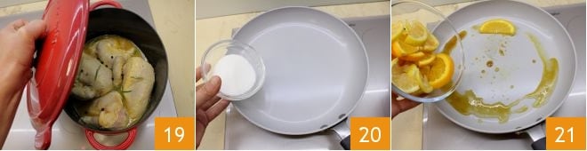 Cover with a lid, allowing it to cook slowly over very low heat for 2 hours 19. In the meantime, you can prepare the caramelized fruit: melt the granulated sugar in a non-stick pan 20 and then add the oranges and lemons you have set aside 21.