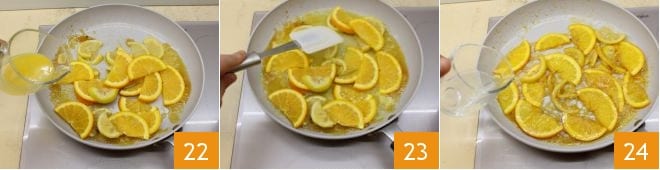 Pour 50 ml of orange juice 22 and let it caramelize for 5-6 minutes, turning the slices with a spatula 23; if you see that the fruit and sugar dry out too much, you can add a little water 24.