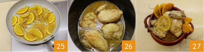 When the fruit is caramelized 25, turn off the heat and set aside. After 2 hours, once the chicken is well cooked 26, transfer it along with the cooking liquid to a clay pot, decorate as desired with the caramelized lemons and oranges, and finally enjoy the clay pot chicken marinated with citrus 27.