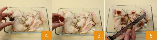 Place the cut chicken in a baking dish and add the flavors: chopped rosemary leaves, whole black peppercorns 4, paprika 5, and grated nutmeg 6.