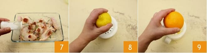 Season with salt 7. Then squeeze the lemons 8 and the oranges 9.