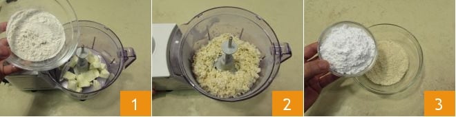 To prepare the cocoa and almond diamonds, start by adding the cold butter cut into pieces and 1 ¾ cups of all-purpose flour into a mixer 1. Blend until you get a sandy dough 2 and set it aside in a large bowl. Take another small bowl to mix the powdered sugar and almond flour 3,