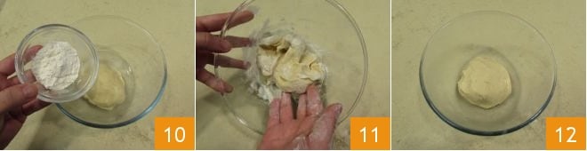 In the other, add the remaining 2 tbsps of all-purpose flour 10 and knead it into the dough with your hands 11 until you obtain a smooth and homogeneous dough ball 12.