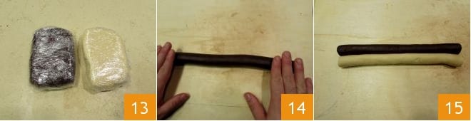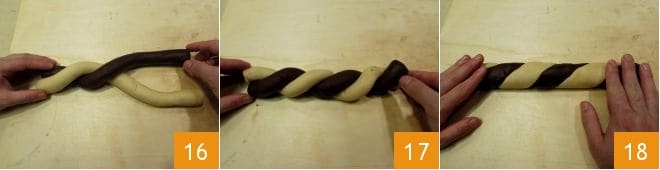 Now take a cocoa cylinder and a plain flour cylinder and place them next to each other: intertwine them by overlapping one roll on the other 16 until you reach the end of the rolls 17: roll the two-color roll obtained, pressing and stretching it slightly with your hands to obtain a new roll about 1 ¼ inches in diameter 18. Repeat the operation with the other two rolls.