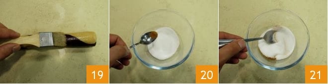 Brush the obtained rolls with a little room temperature water 19. Then in a small bowl, combine the cinnamon with the sugar 20 and mix the ingredients 21.