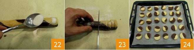 Sprinkle the rolls with the sugar and cinnamon mix obtained 22 and cut the cylinders into slices of ¼ inch thick 23 which you will place on a baking sheet lined with parchment paper. Bake in a preheated static oven at 320°F for 20 minutes (for these cookies, we do not recommend using a convection oven or at most suggest trying the baking of a few pieces as a first batch to check the time and temperature for subsequent ones). Once baked, remove your cocoa and almond diamonds from the oven 24, let them cool slightly, and enjoy!