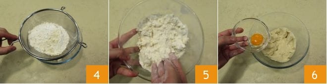 then sift them together into the bowl where you collected the sandy mixture of butter and flour 4, mixing the ingredients quickly with your hands 5. Then add the eggs 6 and continue kneading quickly with your hands to obtain a smooth and homogeneous dough.