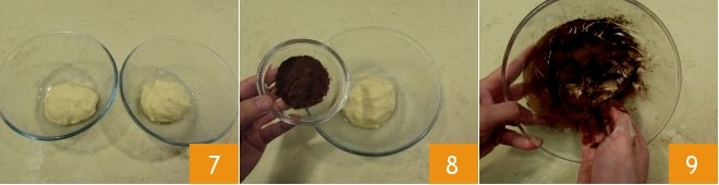 Divide the dough into two different small bowls 7: in one add the cocoa powder 8 and start kneading with your hands 9 until you get a homogeneous dough ball.