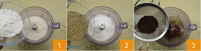 To prepare the cocoa and cherry tartlets start by pouring flour, powdered sugar 1, and hazelnut flour 2 into a mixer bowl. Sift the cocoa powder 3,