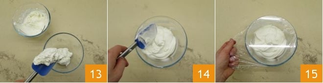 Add the whipped cream to the Greek yogurt in two parts: the first portion will soften the mixture 13, the second will lighten it, so fold gently 14. Cover with plastic wrap and place this in the refrigerator as well 15.