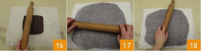 Retrieve the cocoa pastry and flatten it with a rolling pin 16, then roll it out between two sheets of parchment paper using a rolling pin and roll it to a thickness of 1/8-3/16 inch 17. Smooth the surface well by rolling with the pin: this way you will get an even surface 18.