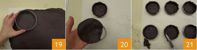 With a 4 1/3 inch cutter, cut out 6 discs 19 and place them inside 6 metal rings measuring 3 3/4 inches and arrange them on a sheet of parchment paper 20. Trim the excess with a small knife. Transfer everything onto a baking sheet and let it rest in the fridge for about an hour 21.