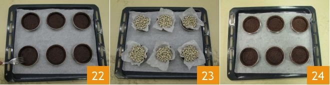 Take the baking sheet and prick the bases of the tartlets 22, place 6 sheets of parchment paper and gently press in ceramic baking beads or dried beans 23, then proceed with How to do blind baking. Bake the tartlets in a preheated oven at 340°F for about 20 minutes; at the end of the baking let them cool before unmolding and let them cool completely 24.