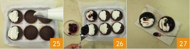 Pour the chilled cream into a piping bag with a Saint Honoré nozzle and pipe over about 2/3 of the base forming a tight serpentine 25. Then garnish the remaining 1/3 with halved cherries, decorating the surface with some cherry pieces and a bit of syrup 26. A mint leaf to refresh and color everything and your delicious cocoa and cherry tartlets are ready: enjoy them 27!