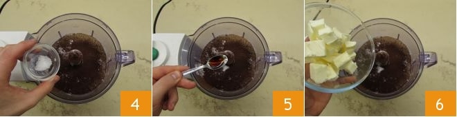 add the salt 4, vanilla extract 5, and cold butter in small pieces 6.