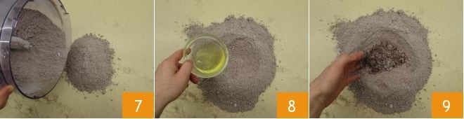Start the blades to get a sandy mixture. Transfer it to the work surface 7 and add the egg whites 8. Knead briefly by hand to combine the ingredients 9.