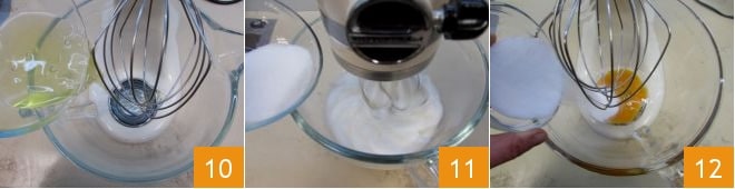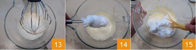 Stop the mixer 13 and gradually add the whipped egg whites to the yolk mixture 14, mixing everything 15.