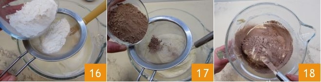 Combine the sifted flour, baking powder 16, and cocoa 17, then mix with a spatula 18 until you obtain a dense and homogeneous batter,