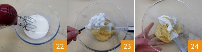 Remove the zabaglione cream from the refrigerator and revive it by working it with an electric mixer, then whip the cream 22 and add it to the now cold cream 23; add it gradually, mixing gently from bottom to top to prevent the mixture from deflating 24.