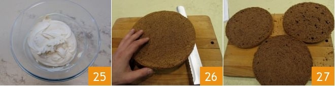 Once finished 25, place it in the refrigerator to cool in a piping bag without a nozzle, to which you can make a hole. When the cake is cold, cut it into 3 equal parts with a knife (26-27);