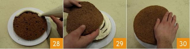 fill the base of the cocoa sponge cake with part of the zabaglione cream with the help of the piping bag 28 and cover it by placing the second layer 29; also fill the second layer with more cream, then cover the cake with the third and final layer 30.