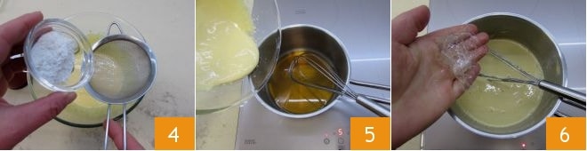 Add the sifted flour 4, mixing well to avoid lumps; pour the mixture into the hot marsala, lowering the heat 5. Thicken the mixture, then turn off the heat; squeeze the gelatin sheets and add them to the hot cream 6