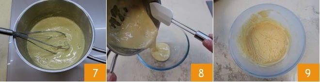 and mix to dissolve completely 7. Transfer the cream to a bowl 8 and cover with plastic wrap in contact 9, letting it cool to room temperature and then in the refrigerator.