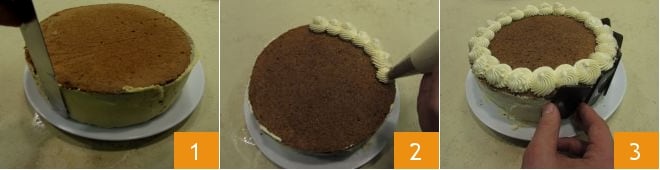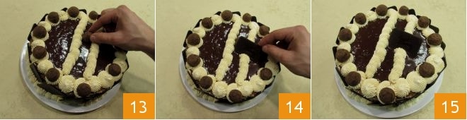 Now proceed with decorating the cake. Place the remaining zabaglione cream in a small bowl and spread it on the sides of the cake with a spatula 1; put the remaining cream in a piping bag with a star nozzle and decorate the surface, making puffs along the edge 2. Once completed, chill the cake in the refrigerator for 1 hour. Then adhere the chocolate sheets all around, placing them obliquely next to each other 3.