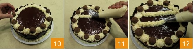 finally, distribute the chocolate truffles on the cream puffs, alternating them 10 (keep one aside for the final decoration). With the remaining cream, create two straight parallel lines (11-12),