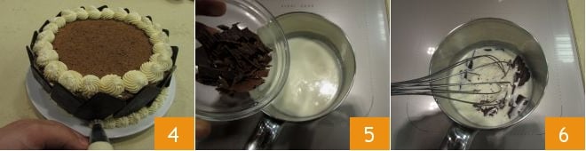 Still using the zabaglione cream, make decorative puffs along the base 4, then focus on the ganache: bring the fresh cream to a boil in a saucepan, then add the chopped dark chocolate 5. Turn off the heat and mix with the whisks 6 until the chocolate is completely melted.