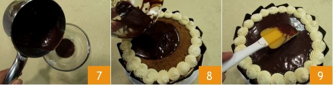Place the ganache you have obtained in a bowl and let it cool slightly 7, then pour it in the center of the cake to cover the undecorated surface 8. Level it with a spatula 9,