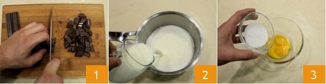 To make the cocoa pavlova with chocolate cream, start by preparing the latter. Roughly chop the dark chocolate 1 and set it aside. Pour the milk and cream into a saucepan and bring it to a simmer 2. In a separate bowl, add the egg yolks and sugar 3 and mix them well with a spatula 3 or whisk.