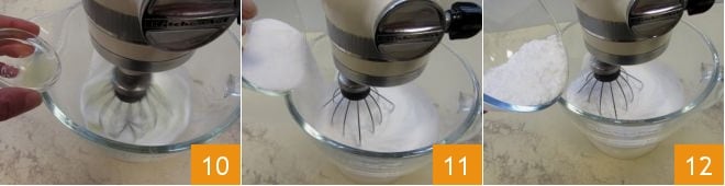start whisking, gradually adding the lemon juice 10, then gradually add the granulated sugar 11 and the powdered sugar 12. Continue whisking until stiff peaks form (it will take about 15 minutes). When the meringue is fluffy, firm, and glossy, stop the mixer.