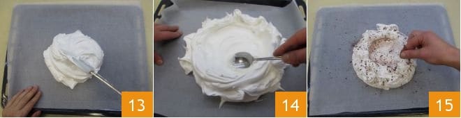 Lightly butter and line a baking sheet with parchment paper (buttering the tray first will hold the parchment paper in place) and gently transfer the meringue 13, forming a 9-inch nest with raised edges using a spatula or spoon, creating a hollow center to hold the chocolate cream and red fruits 14. You can create decorative swirls around the edges for a nice decorative pattern after baking. Dust the pavlova with cocoa powder 15, then bake in a preheated static oven at 212°F for about 1.5 to 2 hours. Leave the oven slightly open for the last 15 minutes, perhaps using a wooden spoon to keep it ajar.