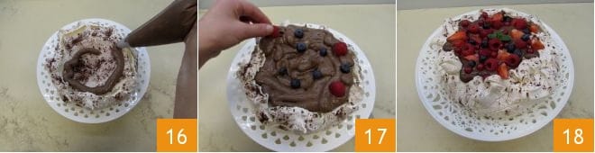 Once cooled, fill the pavlova by spreading the chocolate cream in the center 16. Rinse the red fruits under plenty of fresh water and decorate the cake by placing them all over the surface 17; finally, add the mint leaves: your cocoa pavlova with chocolate cream is ready to be served and enjoyed 18.