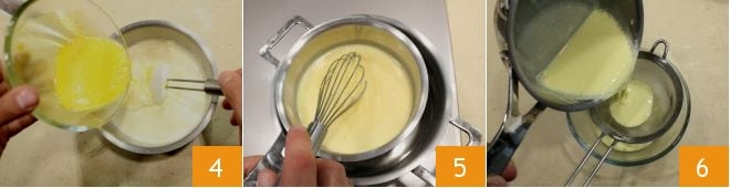 When the milk and cream reach a simmer, turn off the heat and pour the egg mixture into the pan 4. Cook the cream in a bain-marie over low heat, ensuring the water below does not touch the bowl 5. Stir continuously and check with a kitchen thermometer that the temperature reaches 181°F. Once ready, strain the cream through a fine mesh sieve 6.