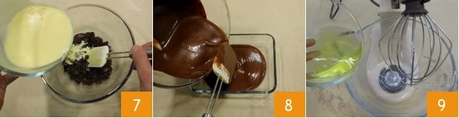Pour the cream over the chopped dark chocolate, stirring gently until completely melted 7. Blend the cream with an immersion blender, then transfer it to a shallow dish 8 and cover with plastic wrap in contact with the surface. Let the cream cool at room temperature, then place it in the refrigerator for at least 3 hours (better overnight). Then, transfer it to a piping bag with no nozzle, and cut a hole. In a stand mixer with a whisk attachment, add the egg whites 9;