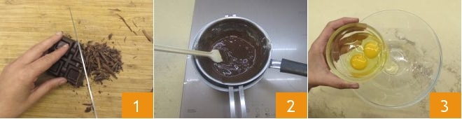 To prepare the coconut and chocolate muffins, first chop the dark chocolate with a knife 1, then melt it in a double boiler 2 or microwave and let it cool. Meanwhile, pour the whole eggs into a bowl 3,