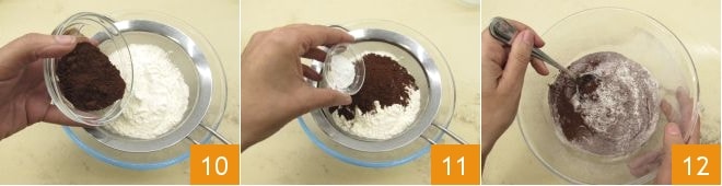 Now take care of the dry ingredients: sift the all-purpose flour and unsweetened cocoa powder into a bowl 10 along with the baking powder 11 and mix well with a spoon 12.